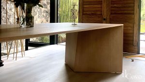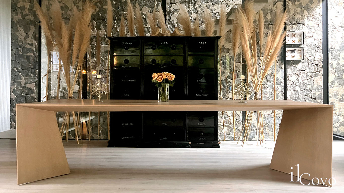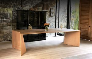 Mesa de madera con enchapados de importación, no considera cabeceras lo que la hace una mesa singular que puede usarse como comedor, mesa de trabajo o escritorio, también podemos tener la opción de fabricarla en una altura de 1.00 m para ser usada como barra con bancos altos.